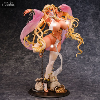 Avec sa chevelure blonde éclatante et son regard énigmatique, Emerin se dresse fièrement, symbolisant la force et la résilience malgré ses liens contraignants. Les chaînes aux bras et aux mollets ajoutent une dimension narrative, suggérant une histoire intrigante derrière cette figure. Le socle est orné de sacs de pièces d'or, évoquant un monde fantastique où l'aventure et la richesse s'entrelacent.