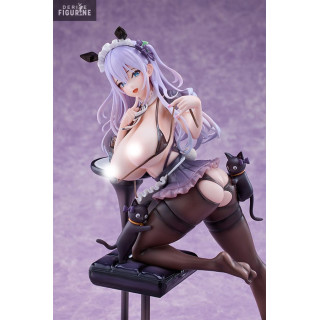 Mia, la protagoniste de cette figurine, est représentée avec élégance, vêtue de son uniforme de servante, tandis que deux petits chats espiègles escaladent joyeusement sur elle. La pose décontractée d'appui sur le tabouret crée une atmosphère délicate, ajoutant une touche de charme et de réalisme à cette œuvre d'art.