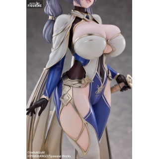 Sylphina se présente dans une armure ornée qui mêle le blanc ivoire et l'or, contrastée par le bleu profond de son justaucorps, symbolisant une fusion de puissance et de féminité. La finesse des détails, de la texture de l'armure aux plis de la cape, reflète la maîtrise et le soin apportés à sa conception.