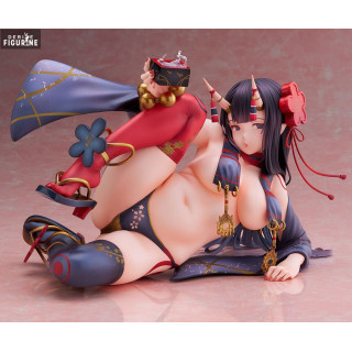 Onikko-chan est représentée allongée, dans une pose décontractée mais provocante, tenant un verre de sake, soulignant son allure séduisante. Elle porte une tenue traditionnelle japonaise, réimaginée de manière audacieuse, avec un kimono partiellement ouvert, révélant ses courbes gracieuses. Les motifs dorés et les ornements rouges de sa tenue contrastent magnifiquement avec sa peau pâle, ajoutant une profondeur visuelle à la figurine.