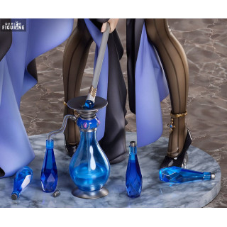 La figurine est complétée par divers accessoires qui enrichissent son esthétique globale. Une pipe à eau ornementale, composée de pièces en plastique transparent bleues, ajoute une dimension supplémentaire à la scène, évoquant une atmosphère exotique et mystérieuse. Les couleurs vives des accessoires contrastent magnifiquement avec la palette sombre de la tenue d'Olivia, créant un équilibre visuel saisissant.
