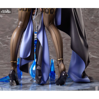 La pose d'Olivia est particulièrement intrigante, soulignant ses courbes gracieuses et sa silhouette élancée. Drapée dans un habit noir aux accents bleus, elle se penche en avant, mettant en valeur son regard mystérieux et son visage délicatement sculpté. Les détails de sa tenue sont remarquables, avec des plis réalistes, des textures variées et des ornements subtilement intégrés.