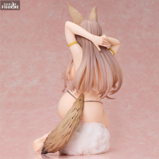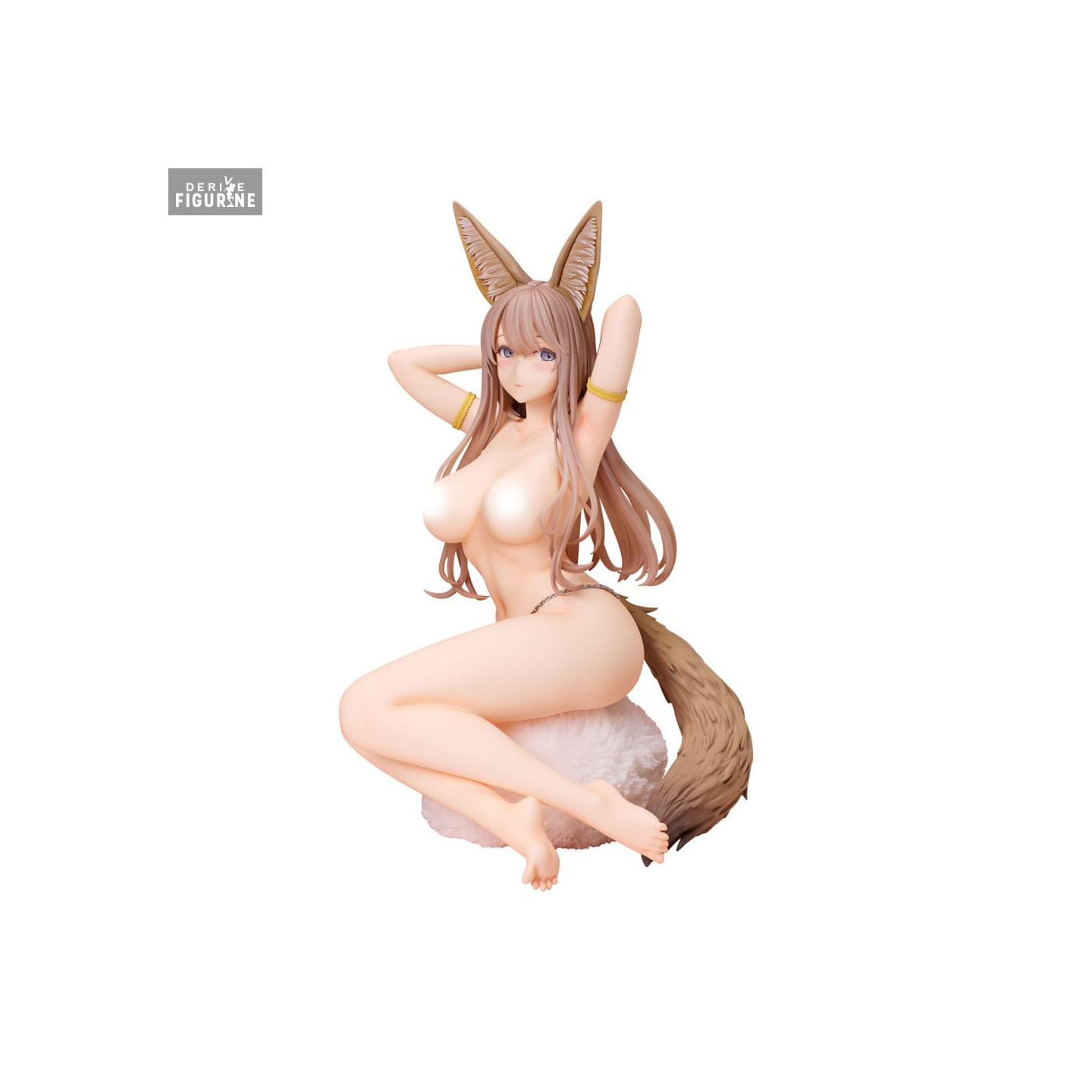 Laura est représentée dans une pose assise gracieuse, accentuant ses courbes élégantes et sa beauté naturelle. Elle porte des oreilles et une queue de renard, ajoutant une touche de mystère et de fantaisie à son apparence. Les détails des oreilles et de la queue sont finement sculptés, avec des textures réalistes qui captivent le regard. Sa longue chevelure blonde est soigneusement reproduite, chaque mèche étant sculptée avec précision pour donner une impression de mouvement et de fluidité.