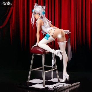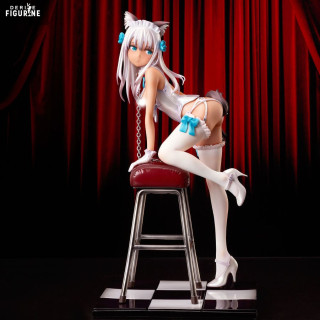 Siiri, un personnage original issu de l'imaginaire de Fumikane Shimada, est mise en lumière avec cette figurine séduisante et raffinée, réalisée à l’échelle 1/7. Cette pièce unique capture la beauté élégante de Siiri dans une posture gracieuse et provocante, appuyée contre un tabouret au style rétro. Détails fins et délicats, sa tenue blanche ornée de rubans bleus contraste harmonieusement avec ses longs cheveux argentés, tandis que ses oreilles de chat ajoutent une touche féline à son allure envoûtante. Le socle en damier noir et blanc renforce l’ambiance sophistiquée de la mise en scène.