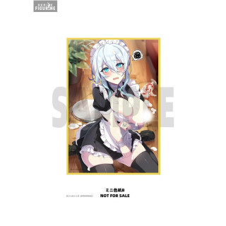 Vêtue d’un uniforme de maid classique noir et blanc, Yukino Mifuyu est mise en valeur par des détails soigneusement réalisés, tels que les plis de sa jupe, ses bas brillants, ou encore les ornements délicats de son tablier. Sa chevelure bleue pâle ondulée, subtilement ombrée, accentue son allure éthérée. La mise en scène, avec des accessoires renversés au sol, ajoute une touche narrative qui capture un moment de maladresse charmant et humain.