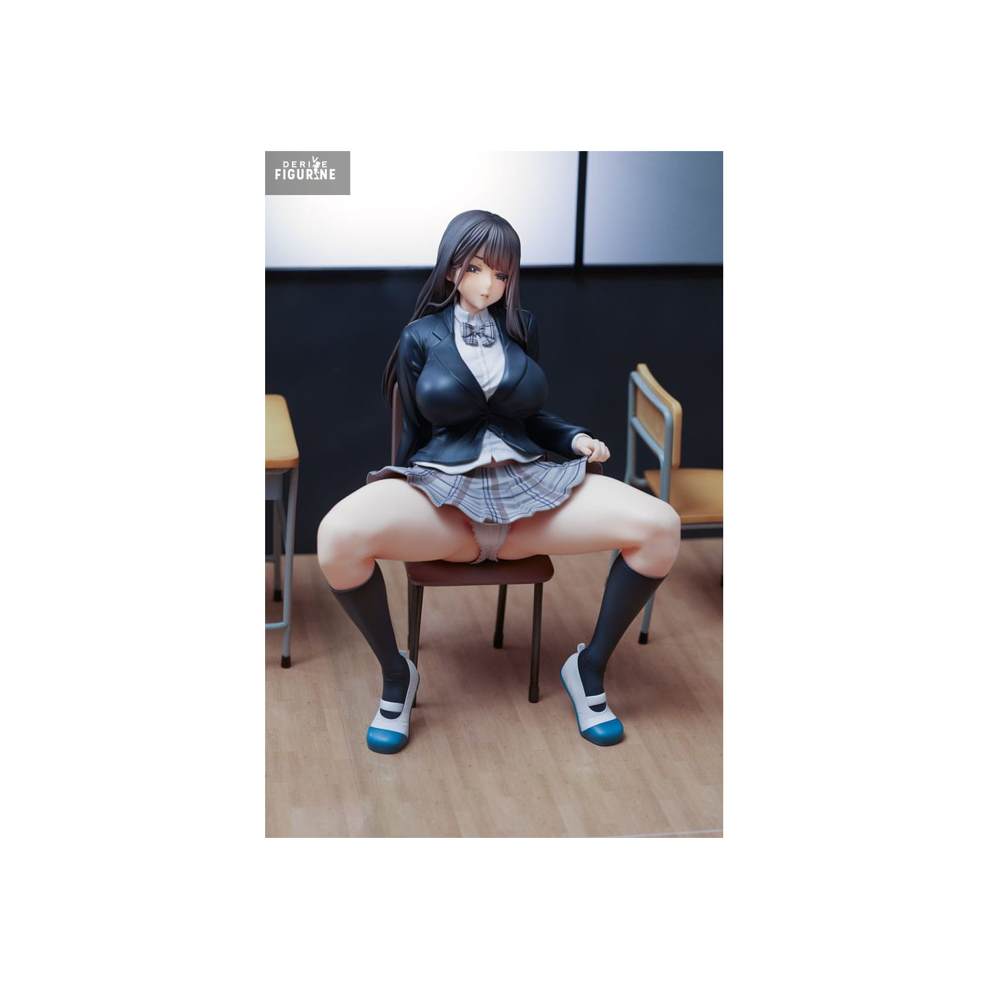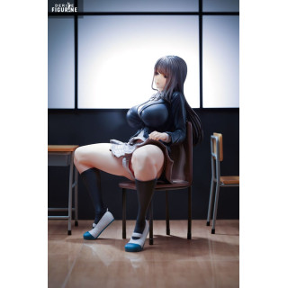 Juuna-Chan est représentée dans une posture décontractée et provocante, assise sur une chaise, avec une expression faciale malicieuse et pleine de confiance. Son uniforme scolaire, soigneusement sculpté, révèle des plis réalistes et des détails minutieux qui mettent en valeur l’attention portée à la qualité de la conception. La palette de couleurs sobres, composée de noir, de blanc et de gris, renforce l’aspect réaliste tout en mettant en lumière les contrastes de la figurine. Les chaussures et les chaussettes hautes ajoutent une touche d’élégance à cette représentation artistique.