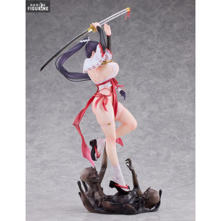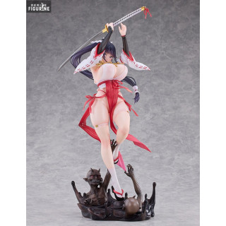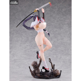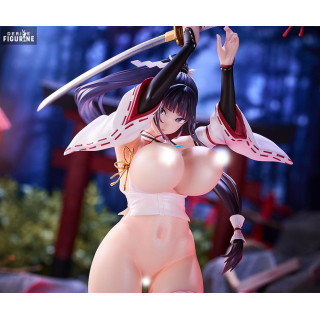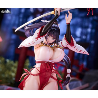 Sakuya Todo est un personnage original qui dégage à la fois puissance et sensualité. Armée d’un katana, figée dans un mouvement acrobatique aérien, elle incarne la guerrière prête à frapper avec une précision implacable. Son design s’inspire clairement de l’imagerie traditionnelle japonaise, mêlant l’élégance des vêtements de prêtresse shinto (miko) à une tenue revisitée dans un style beaucoup plus provocant. Sa longue chevelure violette s’envole dans le vent tandis que ses manches flottantes et son ruban écarlate ajoutent du dynamisme à la scène. Elle n’est pas issue d’un anime ou d’un manga, mais elle est pensée comme une héroïne digne des récits fantastiques nippons, opposant grâce divine et puissance guerrière.