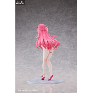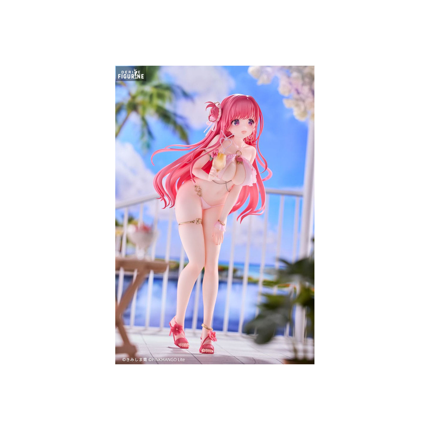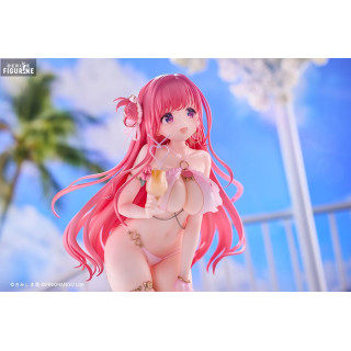 Riko-chan, personnage original imaginé par l’illustrateur Ao Kimishima, nous plonge ici dans une scène estivale tout en douceur et en sensualité. Avec ses longs cheveux roses ondulants, ses yeux brillants de tendresse et son sourire timide, elle incarne la douceur de vivre et le charme des vacances au soleil. Vêtue d’un maillot de bain délicat aux tons clairs, parsemé de fleurs et d’éléments dorés, elle tient un cocktail à la main, comme figée dans un instant de détente au bord de la mer. Son design combine innocence, féminité et élégance, dans une mise en scène aussi romantique que rafraîchissante.