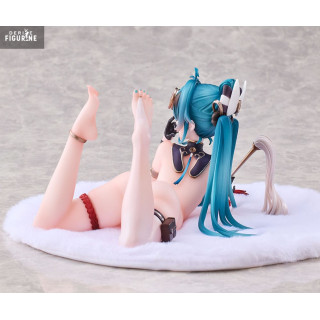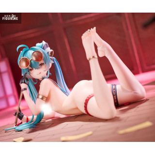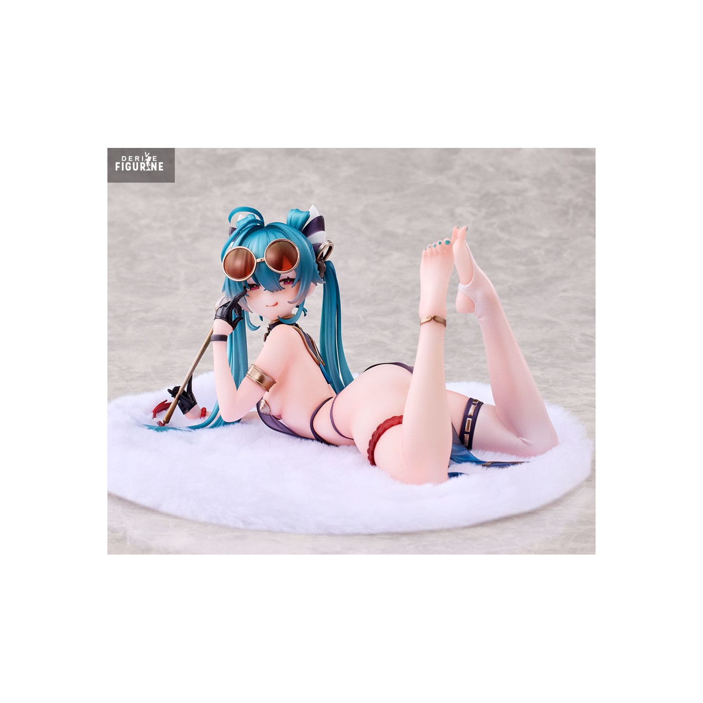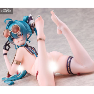 La sculpture est soignée malgré le format réduit : on distingue clairement les détails du visage, les mèches de cheveux turquoise, les plis du tissu, et les petits éléments dorés. La position joue sur la provocation douce, sans excès, avec une vraie personnalité qui se dégage de la scène.
