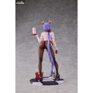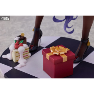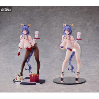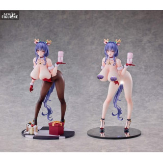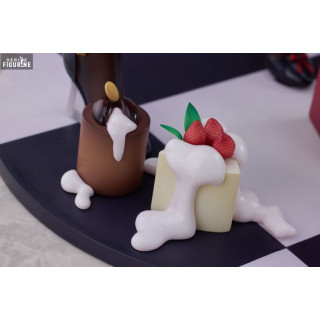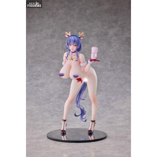 Le design s’inspire fidèlement de l’illustration d’origine : un corset rouge bordé de fourrure blanche souligne sa taille fine, tandis que ses bas marron-noir dévoilent la courbe gracile de ses jambes. Sa longue chevelure violette, légèrement bouclée, retombe en cascade derrière elle, ornée d’un headband à bois de renne décorés de baies. Sur le socle damier, quelques bougies fondantes et un petit paquet cadeau évoquent l’atmosphère chaleureuse des célébrations.