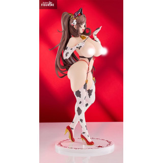 La figurine reproduit fidèlement son design visuel extravagant : combinaison moulante à motifs vache noire et blanche, nouée par des rubans rouges stratégiquement placés. Elle porte des sabots à talons rouges, des grelots dorés aux cuisses, et un collier assorti autour du cou. Ses longues mèches brunes ondulent jusqu’aux hanches, et ses cornes, oreilles de vache et queue complètent le look hybride. Son expression joyeuse et sa posture en mouvement accentuent l’effet vivant de la scène.