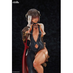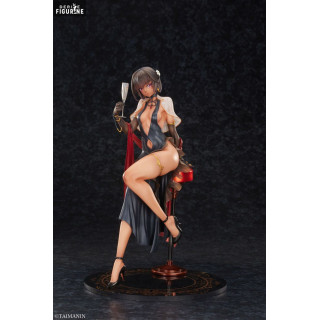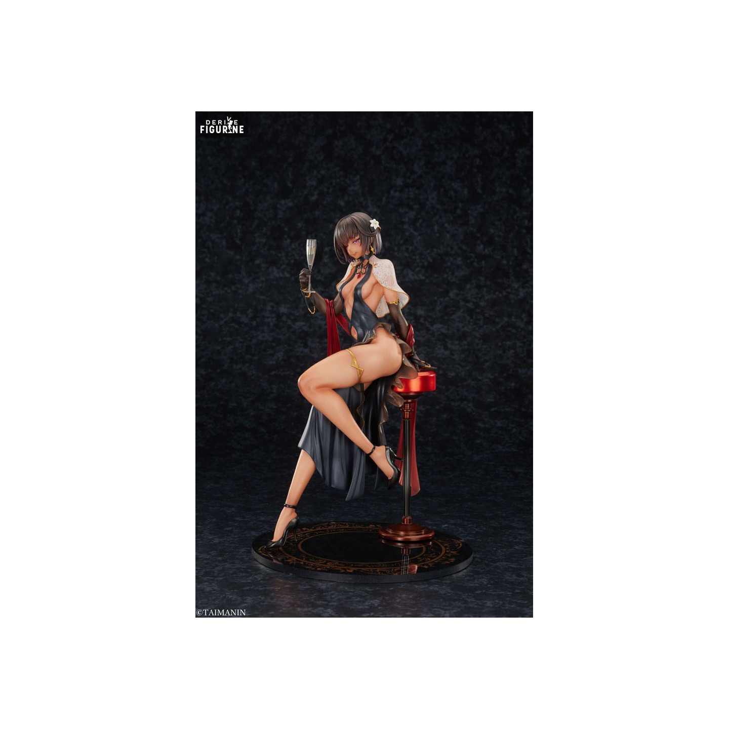 La figurine la représente dans une tenue de soirée sensuelle et élégante : une longue robe noire fendue qui dévoile ses jambes et souligne ses formes, complétée par des détails dorés et une cape blanche posée sur ses épaules. Son verre à la main et son regard assuré accentuent son aura de confiance et de séduction.