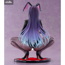 Visuellement, la figurine est marquante : oreilles de lapin noires, queue en pompon, col blanc et nœud papillon, veste de smoking moulante et body noir ouvert. Elle porte des bas en résille noire intégrés et des talons aiguilles vernis. Ses longs cheveux violets dégradés en pointes bleu clair encadrent son visage et retombent élégamment dans son dos. Le socle rond rouge brillant fait ressortir la silhouette de façon éclatante.