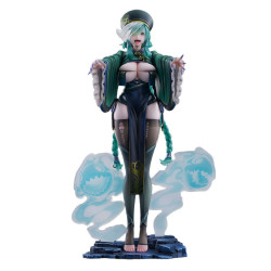 La statue la montre debout sur un socle de dalles sombres, pieds nus, jambes serrées, coiffée de longues tresses vert turquoise qui tombent jusqu’aux genoux et d’un chapeau rond assorti décoré d’un talisman clair. Sa tenue reprend l’idée d’une robe traditionnelle verte ouverte sur le buste, avec de larges manches qui tombent et se terminent par des ongles allongés, tandis qu’un long panneau sombre orné d’un motif doré descend au centre jusqu’aux pieds. Des lanières et jarretelles encadrent ses cuisses, le reste des jambes étant couvert par de hauts bas foncés. Dans le dos, deux grands esprits translucides bleu pâle sont fixés de façon à se déployer de chaque côté, créant une sorte d’aura fantomatique qui donne beaucoup de présence à la pièce une fois exposée.