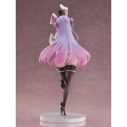 Visuellement, Lolly se distingue par une longue chevelure lavande aux pointes rosées, sculptée en mèches très aériennes qui s’évasent autour d’elle. Sur la tête, on voit de grandes oreilles de lapin blanches à l’intérieur rose, ainsi qu’un petit haut-de-forme noir. Elle porte un body blanc accompagné d’un nœud papillon rose rayé au cou, avec des gants blancs et des accessoires noirs (collier et anneaux/bracelets). Les jambes sont habillées de bas noirs cuisse haute bordés de volants clairs, et la silhouette est complétée par des escarpins noirs à talons fins. L’ensemble repose sur une base ronde blanche, simple, qui met surtout l’accent sur la posture.