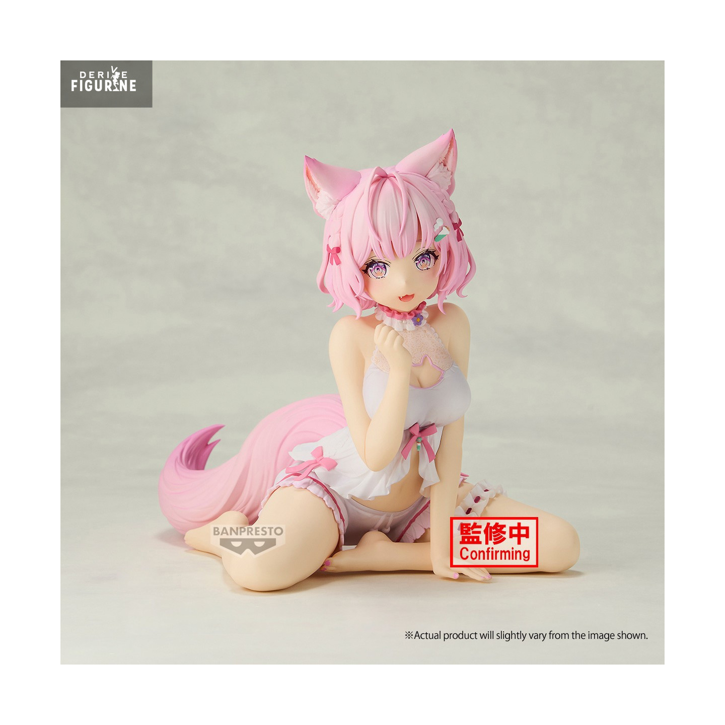 La figurine en PVC, haute d’environ 13 cm, la montre assise sur ses genoux, le buste légèrement penché en avant comme pour offrir une conversation intime. Sa chevelure rose pastel, encadrée par de délicates oreilles de renard, est sculptée en volutes naturelles qui ajoutent du mouvement. Le petit haut à bretelles et le short à volants sont soulignés par des rubans roses et de subtiles dentelles : un équilibre parfait entre confort et élégance.