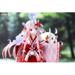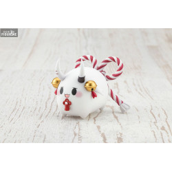 Le design se distingue par ses manches longues décorées de rubans et d’ornements à pompons, son kimono rouge aux motifs délicats et sa chevelure blanche teintée de rose pastel. Deux petites cornes ornent son front, et trois esprits translucides flottent autour d’elle dans des tons violets. Les textures sont minutieusement travaillées, du plissé de son vêtement aux détails de son socle granuleux.