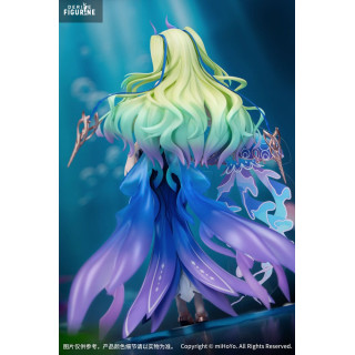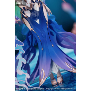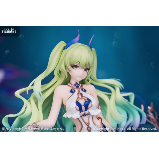 La figurine PVC 1/8 de Myethos, issue de la collection Gift+, est une véritable sculpture aquatique. Les dégradés de sa robe bleutée ondulent comme des courants marins, ses cheveux vert-lagon s’enroulent avec fluidité, et les motifs coralliens semi-translucides ajoutent une touche d’irréel. La posture est subtile, presque paresseuse, mais chaque pli, chaque ombre, chaque détail évoque la maîtrise totale de son image.