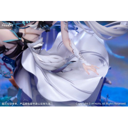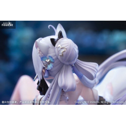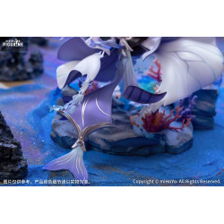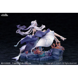 La figurine présente Kiana assise avec élégance, sa longue chevelure argentée flottant derrière elle comme portée par le courant. À ses côtés, une silhouette délicate prolonge l’effet de symétrie et de mouvement. L’ensemble repose sur un socle orné de coraux, roches et vagues cristallines, renforçant l’impression d’un monde sous-marin figé dans le temps.