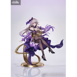 Assise sur un socle doré au design astral, Herta adopte une posture élégante, jambes croisées et regard assuré. Elle tient un cor doré finement sculpté, un instrument de musique qui apporte une touche baroque et inattendue à sa mise en scène. Sa tenue violette riche en détails mêle volants, transparence et finitions satinées.