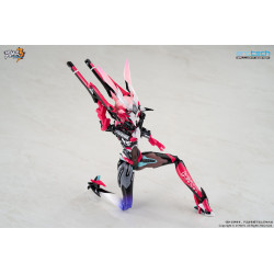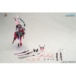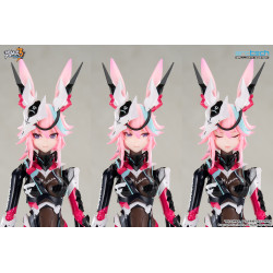 Le design mélange des pièces d’armure anguleuses et des surfaces lisses dans un ensemble très dynamique : on retrouve un contraste marqué entre le noir brillant, le blanc et le rose néon, avec quelques touches de turquoise et de violet sur les membres. Le casque coiffé de longues “oreilles” façon oreilles de renard ou d’ornements mécaniques, la visière stylisée et les plaques sur les épaules accentuent la silhouette élancée. Les jambes sont protégées par des éléments d’armure affûtés, notamment un protège-tibia rouge vif avec marquages, tandis que les bras sont bardés de modules et de lames. Les trois pièces noires fixées sur un second support rappellent des armes volantes ou drones en appui, et les différents points d’articulation visibles sur la figurine permettent de varier les poses tout en gardant une bonne stabilité grâce aux socles transparents.
