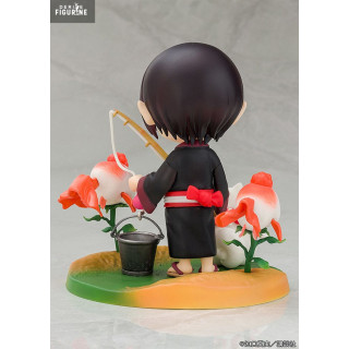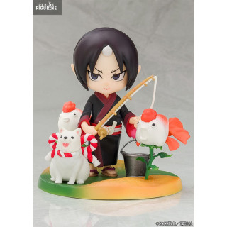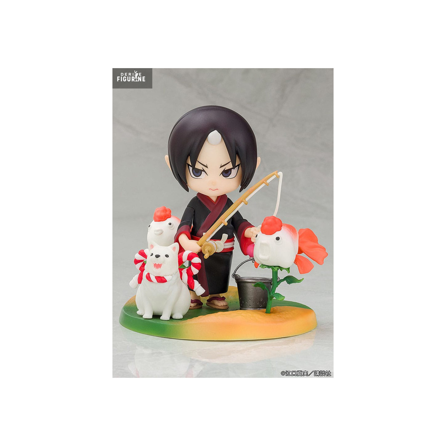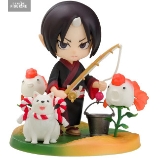 La figurine capture une scène pleine de caractère, où Hôzuki, en kimono sombre rehaussé de détails rouges, tient une canne à pêche, prêt à attraper un poisson pour une activité typiquement infernale. À ses côtés, Shiro arbore un sourire joyeux, orné d’un collier festif à rayures rouges et blanches. La mise en scène est complétée par des éléments fantaisistes, comme une fleur à visage de poisson rouge et un seau métallique qui ajoutent une dimension ludique et décalée à l’ensemble.
