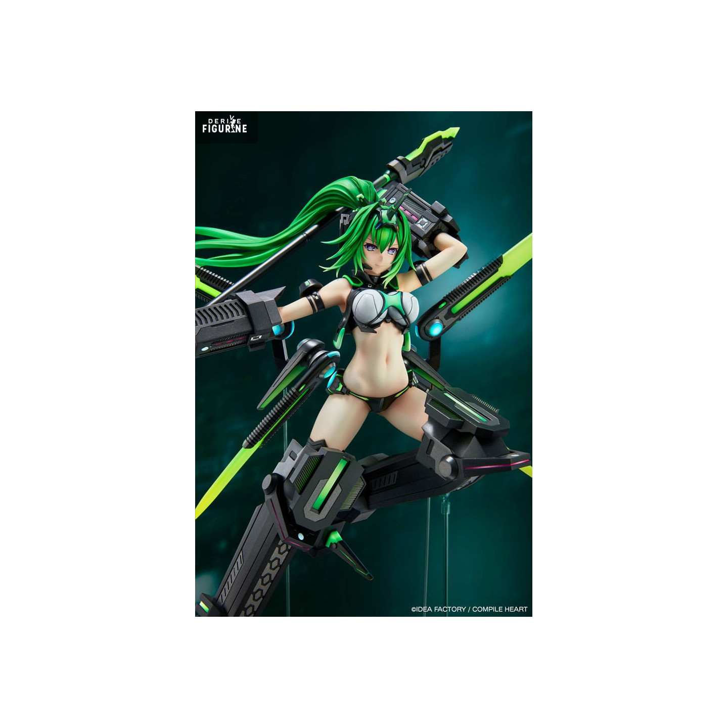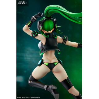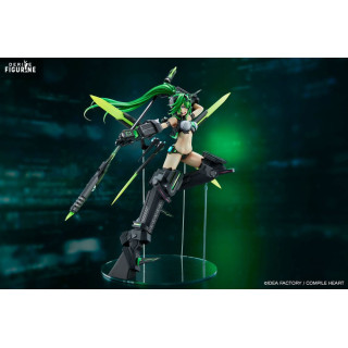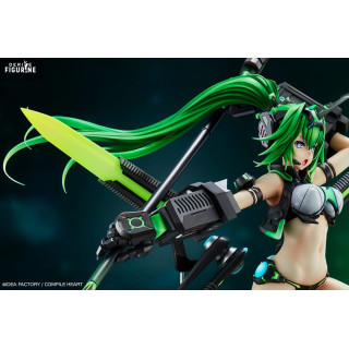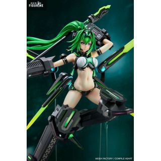 Son design est bluffant : chevelure verte éclatante balayée vers l’arrière, armure mécanique noir mat aux reflets métalliques, lames translucides fluo montées sur des bras articulés. La tenue minimaliste reste fidèle au style Neptunia, tout en s’intégrant à la sophistication technique de l’ensemble. Le socle transparent donne une impression de suspension dans l’action.