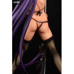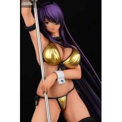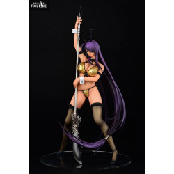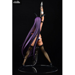 Elle arbore un bikini métallisé doré, assorti aux manchettes blanches, aux oreilles de lapin noires et aux bas résille foncés. Sa longue chevelure violette descend en vague jusqu’au socle, accentuant la silhouette. L’imposante hallebarde à tête bestiale ancrée au sol vient rappeler sa nature de combattante, même dans une tenue festive.