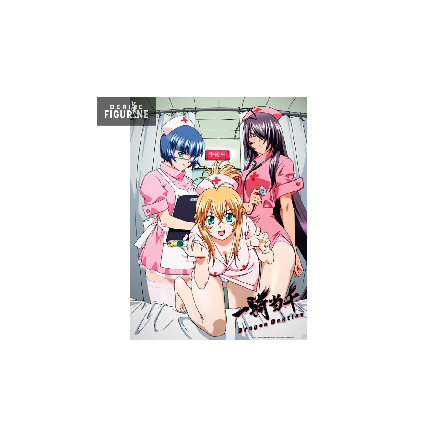 Voici un poster avec les personnages principaux de Ikki Tousen : Dragon Destiny. Hakufu Sonsaku, Shimei Ryomou et Unchô Kan-u sont toutes trois en tenue d’infirmière très sexy. Attention si vous n’aimez pas les piqûres...