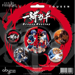 Badges d'Ikki Tousen: Dragon Destiny qui mesurent environ 3 et 5,5 centimètres de diamètre et qui possèdent une épingle à nourrice à l’arrière pour les attacher. Le fabricant est ABYstyle.