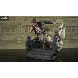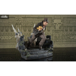 On retrouve son costume iconique : veste en cuir, chemise beige entrouverte, pantalon kaki, ceinture avec fouet et sacoche. Le socle reproduit l’entrée du temple piégé, avec colonnes en ruines, pierres sculptées et effet de poussière soulevée.