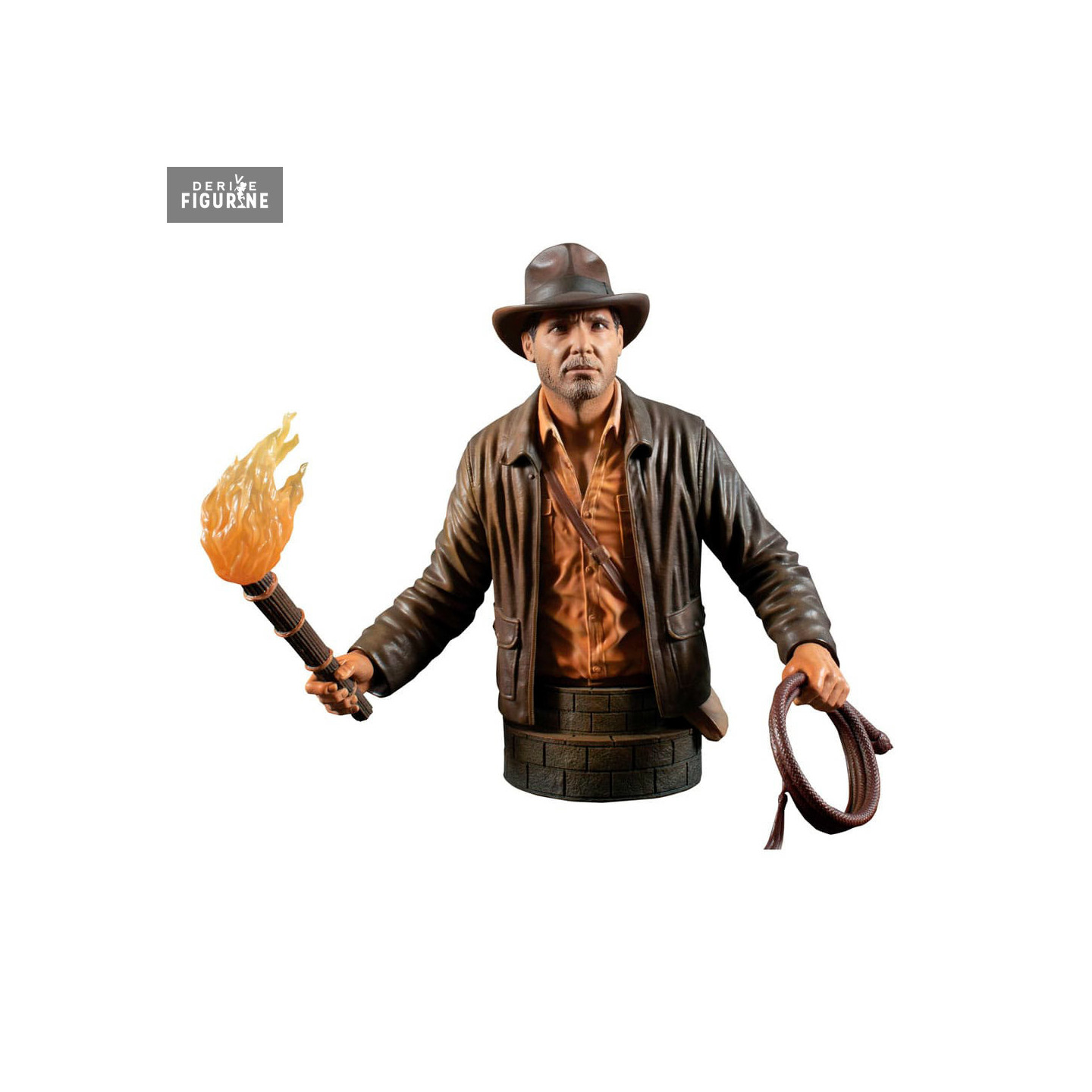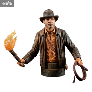 Buste officielde Indiana Jones en résine mesurant environ 15 centimètres de haut, à l'échelle 1/6. Le fabricant est Gentle Giant.