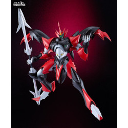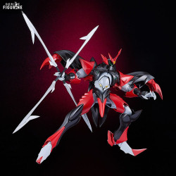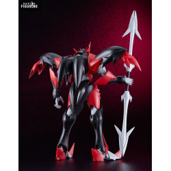 La figurine représente Tekkaman Evil en posture offensive, flottant dans les airs, lance à double pointe en main. Son armure est d’un noir brillant avec des sections rouges vives et des pointes argentées, évoquant une esthétique agressive et élégante. Le casque arbore des cornes rouges et un regard vert perçant. Les ailes rigides déployées dans le dos renforcent son style tranchant et symétrique.