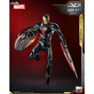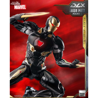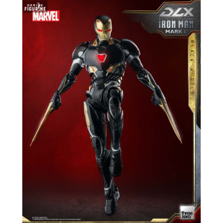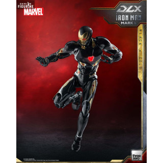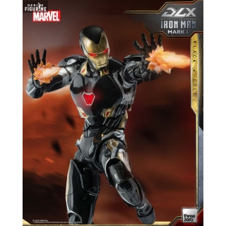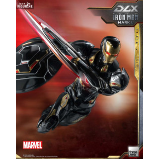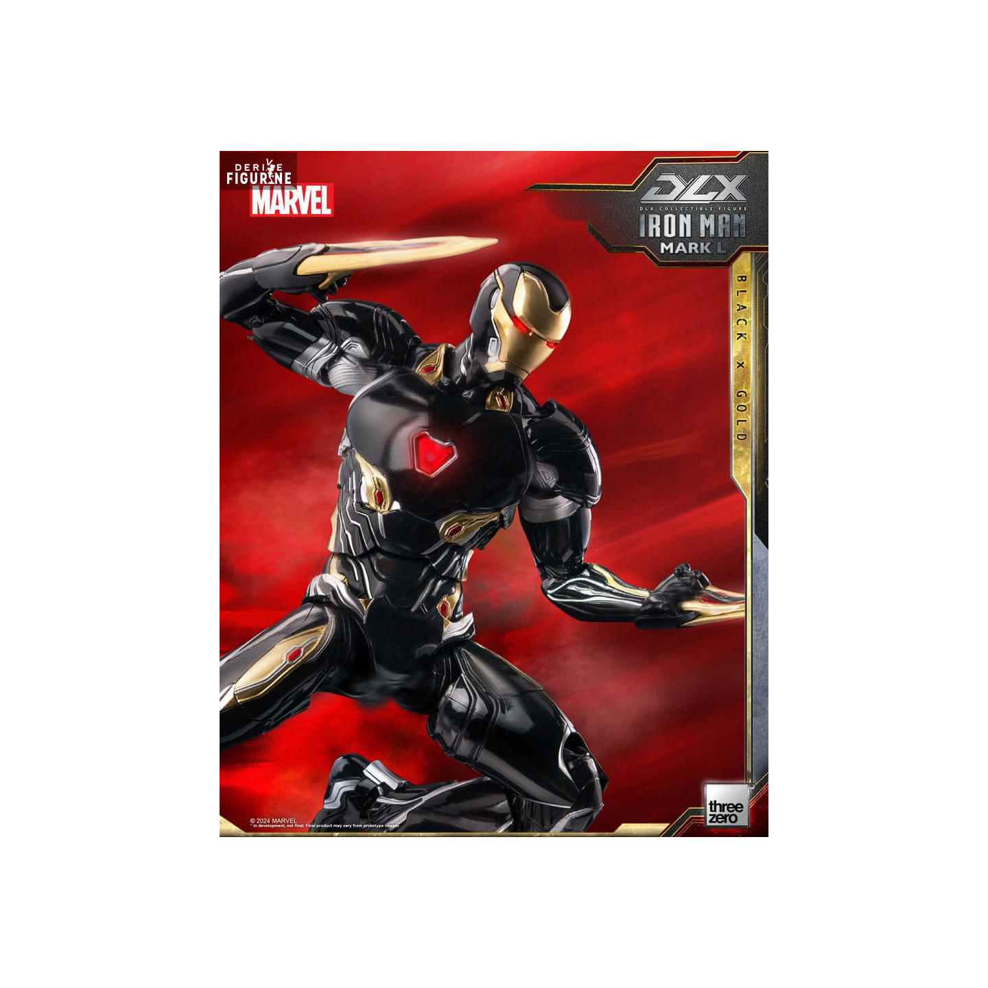 Figurine officielle de Iron Man (Black X Gold) mesurant environ 17,5 centimètres de haut, à l'échelle 1/12. Elle est issue de la collection DLX. Le fabricant est ThreeZero.