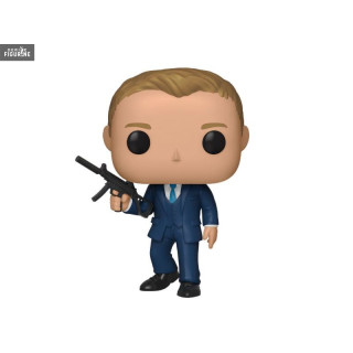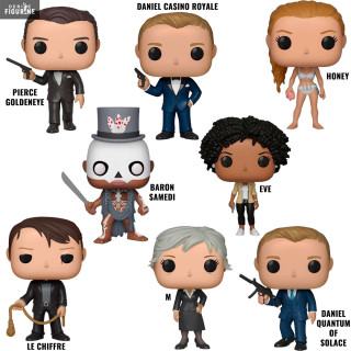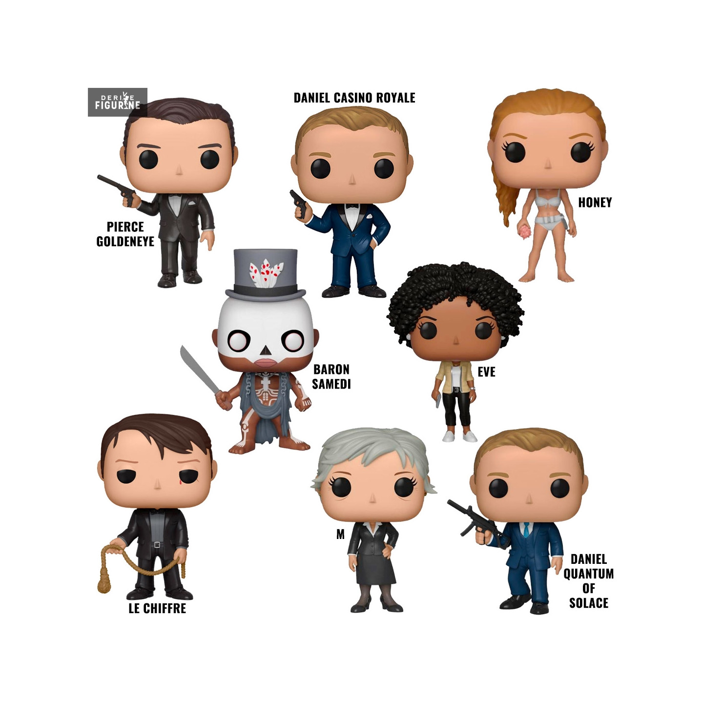 Figurine James Bond officielle au choix entre Pierce, Daniel (2 versions), Honey, M, Baron Samedi, Eve ou Le Chiffre mesurant environ 9 centimètres de haut en vinyle. Le fabricant est Funko.