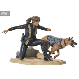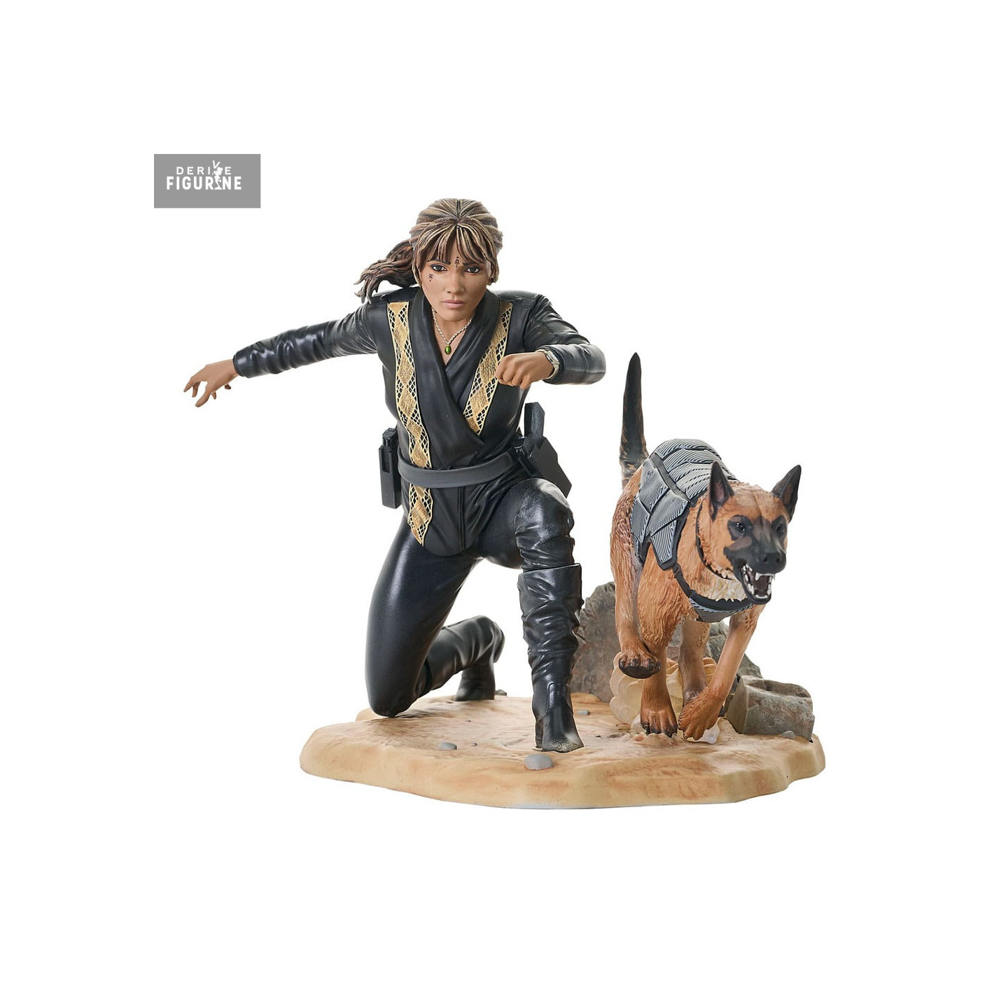 Chaque détail de cette figurine a été minutieusement reproduit, du costume noir emblématique de Sofia, rehaussé par des éléments dorés, jusqu'à l'expression déterminée sur son visage. Le chien, qui l'accompagne dans cette scène, est également représenté avec un réalisme impressionnant, ajoutant une touche d'intensité à cette pièce de collection.