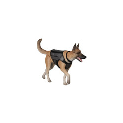 Visuellement, la figurine montre Sofia dans son ensemble noir près du corps : pantalon ajusté, bottes montantes et veste croisée ornée de motifs dorés sur le devant et au col. Son visage arbore une coupe courte brune et une expression concentrée, et elle tient une arme de poing dans la main droite. Les articulations visibles aux épaules, coudes, genoux et hanches permettent de lui faire prendre différentes poses d’action. Les deux chiens, de type berger, portent des harnais tactiques sombres et sont sculptés en position de marche, langue sortie pour l’un d’eux, prêts à se jeter sur la cible à ses côtés.