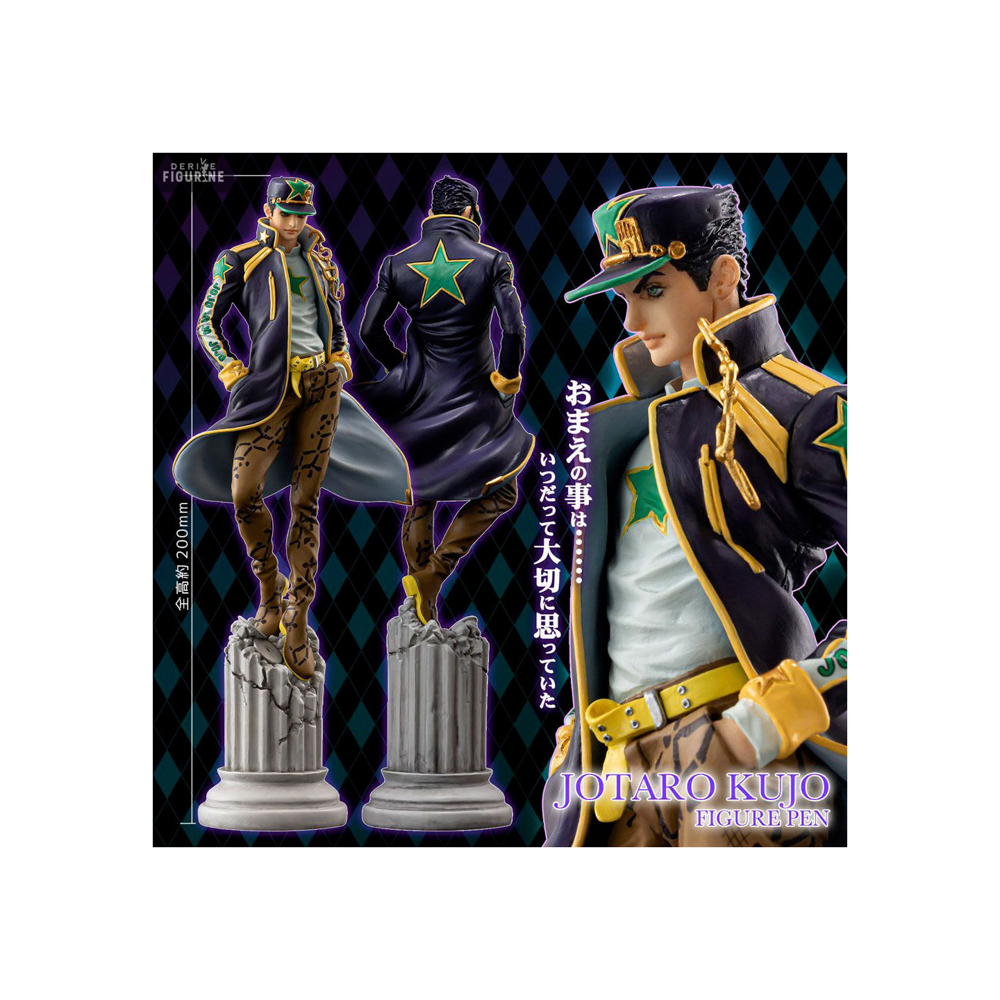 Jotaro Kujo est le père de Jolyne ainsi que son allié dans la partie baptisée Stone Ocean de l'histoire de JoJo's Bizarre Adventure. Cette figurine faisant également office de stylo Jotaro Kujo le montre dans sa tenue portée pendant ce chapitre.