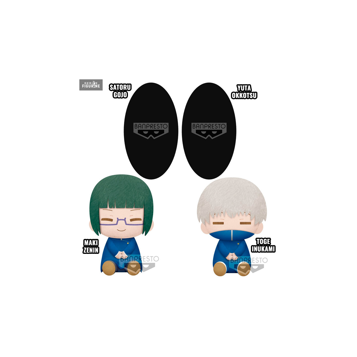 Peluche officielle au choix entre Satoru Gojo (0), Yuta Okkotsu (0), Toge Inukami ou Maki Zenin mesurant environ 20 centimètres de haut. Le fabricant est Banpresto.
