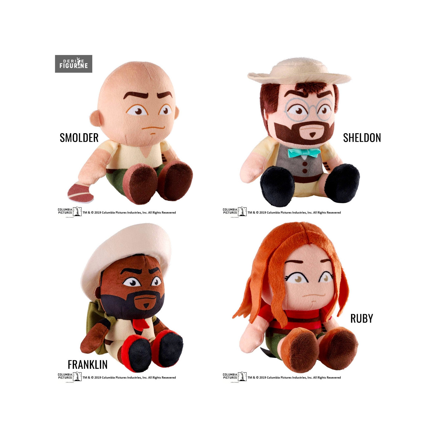 Peluche officielle de Jumanji au choix entre Ruby (~16 cm), Sheldon (~17 cm), Smolder (~15 cm) ou Franklin (~19 cm) en 100% polyester. Le fabricant est Noble Collection.