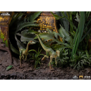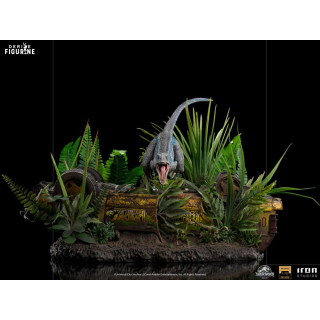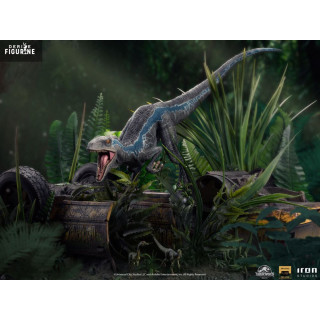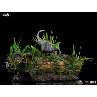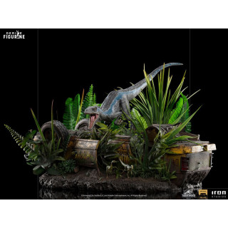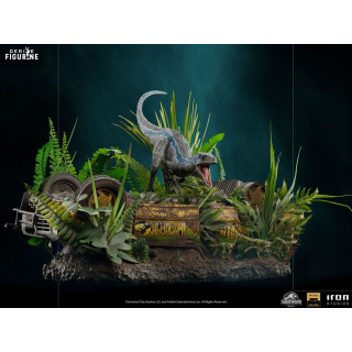 Oubliez la simple figurine statique : ici, Blue se dévoile en grand spectacle avec cette version Deluxe à couper le souffle. Toujours à l’échelle 1/10, toujours signée Iron Studios, mais cette fois, le prédateur n’est plus seul. Il évolue dans un décor ultra détaillé qui recrée tout le frisson de Jurassic World — jungle dense, carcasses de véhicules, végétation envahissante... tout y est.