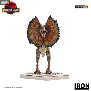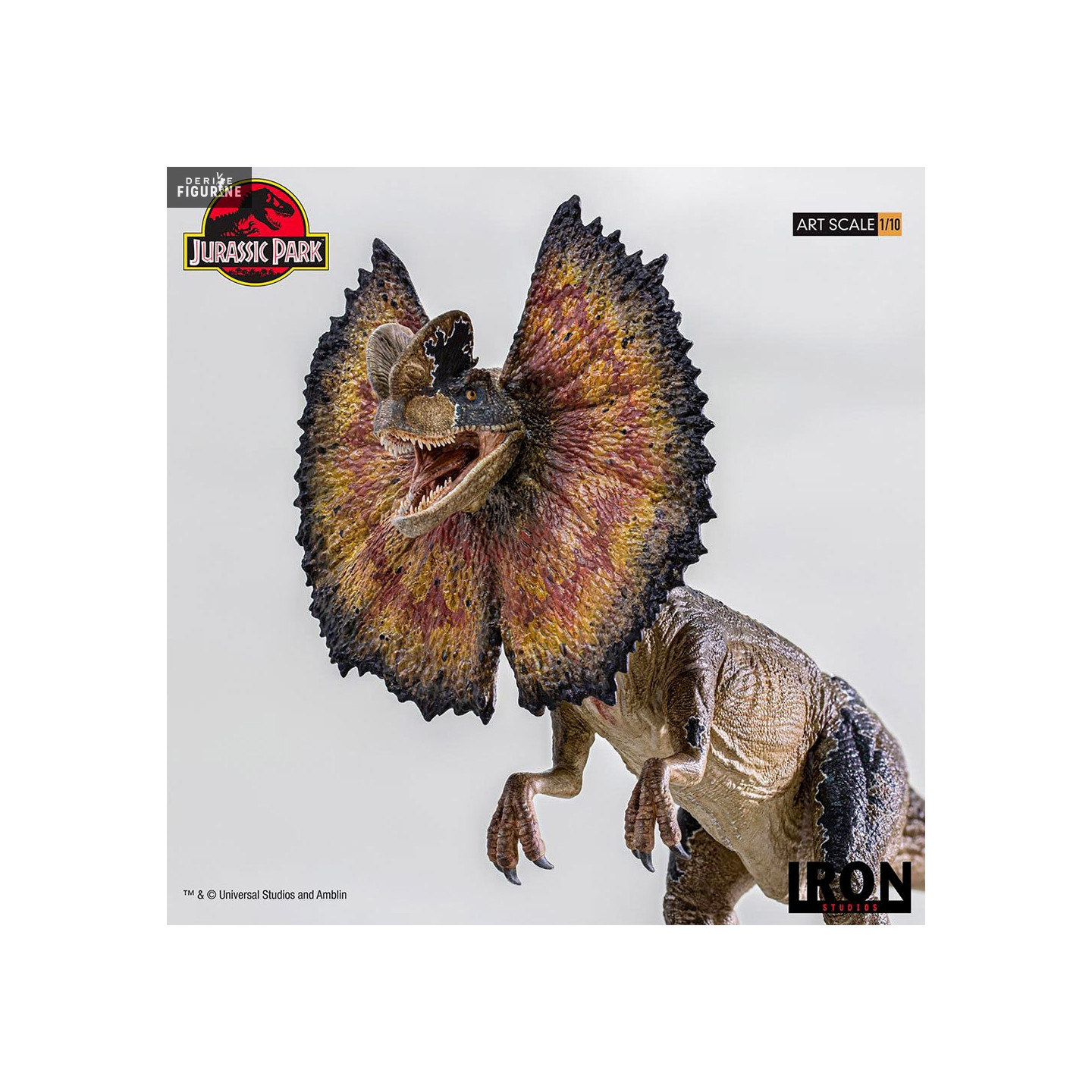 Figurine officielle de Dilophosaurus en résine mesurant environ 18 centimètres de haut, à l'échelle 1/10. Elle est issue de la collection BDS Art Scale. Le fabricant est Iron Studios.