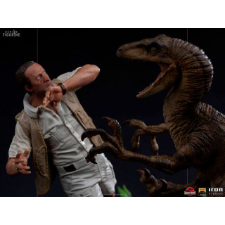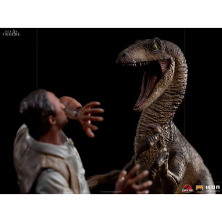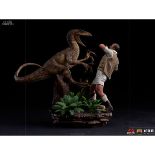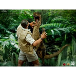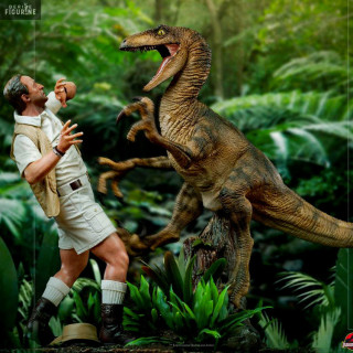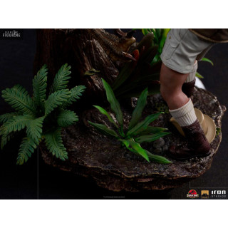 Figurine officielle de Jurassic Park en résine mesurant environ 25 x 26 x 17 centimètres, à l'échelle 1/10. Elle est issue de la collection Deluxe Art Scale. Le fabricant est Iron Studios.
