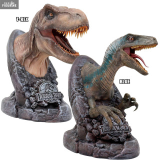 Les univers de Jurassic Park et Jurassic World sont réunis dans deux magnifiques bustes ! Retrouvez le T-Rex et sa puissante mâchoire, grande ouverte prête à vous dévorer ainsi que la plus connue des vélociraptors Blue de Jurrasic World. Les deux sont sur des socles imitations pierre ornés de leur logo respectif. De plus, chaque buste est limité au nombre d'exemplaire correspondant à leur année de sortie, soit 1993 pour le T-Rex ou 2015 pour Blue.