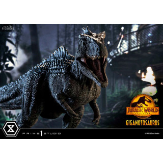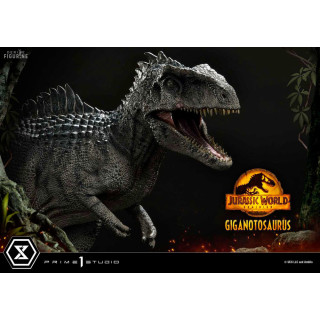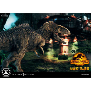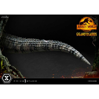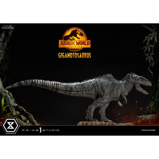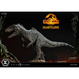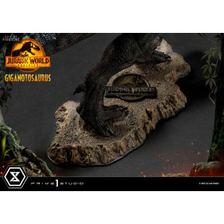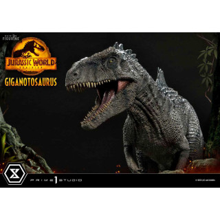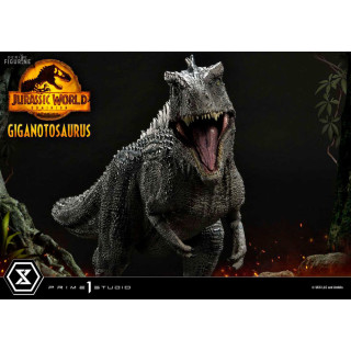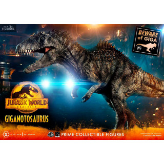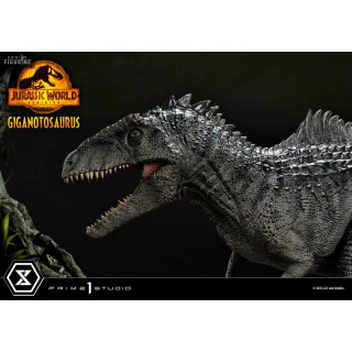 Figurine officielle de Giganotosaurus en résine mesurant environ 22 x 25 x 48 centimètres, à l'échelle 1/10. Elle est issue de la collection Prime Collectibles. Le fabricant est Prime 1 Studio.