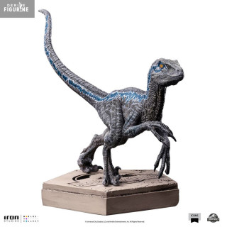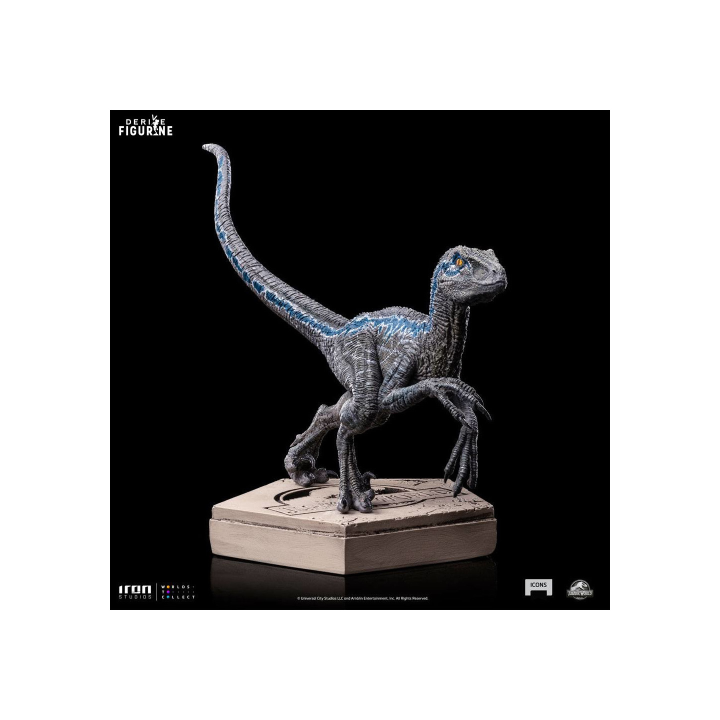 Figurine officielle de Velociraptor Blue en résine mesurant environ 9 x 12 x 10 centimètres. Elle est issue de la collection Icons. Le fabricant est Iron Studios.