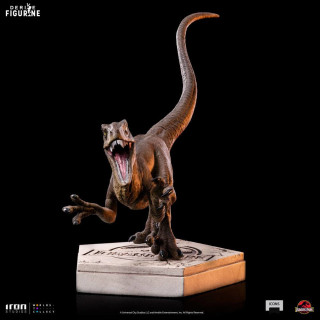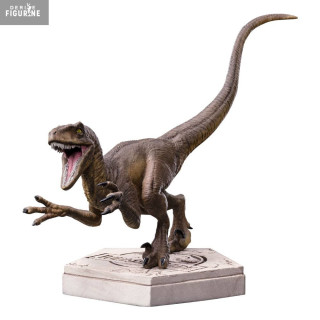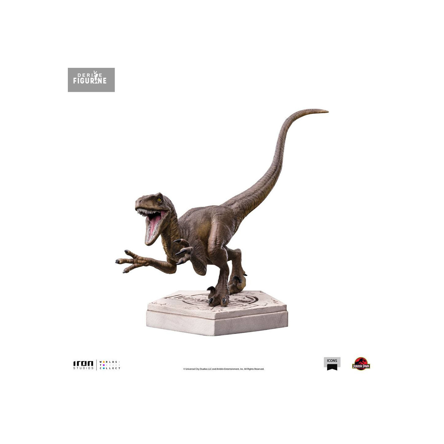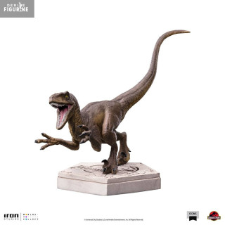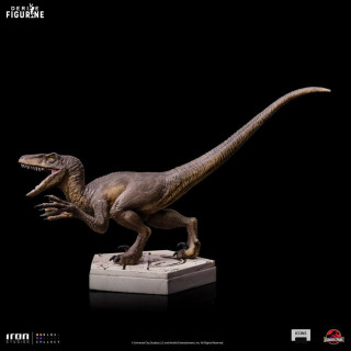 Figurine officielle de Velociraptor A en résine mesurant environ 9 x 12,5 x 10 centimètres. Elle est issue de la collection Icons. Le fabricant est Iron Studios.