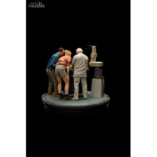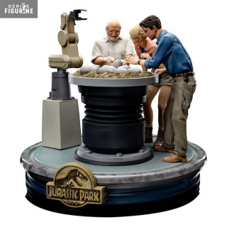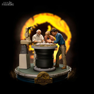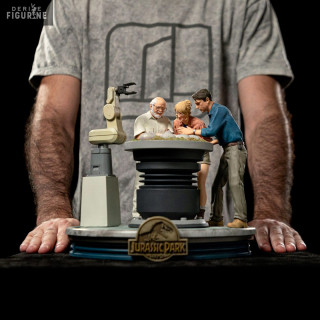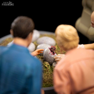 La figurine "Dino Hatching" en Art Scale de Jurassic Park est une pièce de collection extraordinaire qui capture un moment emblématique du film. Cette figurine met en scène John Hammond, le PDG d'InGen et le créateur de Jurassic Park, aux côtés de deux autres personnages clés : Ellie Sattler, une paléobotaniste, et Alan Grant, un paléontologue respecté. Le moment capturé est celui de la naissance d'un dinosaure clone dans le laboratoire de clonage. On peut voir John Hammond, ganté, aidant à la naissance du dinosaure, tout en souriant avec une fierté paternelle. À ses côtés, Ellie Sattler est fascinée par ce miracle de la vie et de la science, tandis qu'Alan Grant exprime sa surprise en découvrant l'espèce du nouveau-né. Cette scène est un moment clé du film où les personnages découvrent la réalité des dinosaures vivants créés dans le parc. La figurine est méticuleusement détaillée, avec une attention particulière portée aux traits du visage des acteurs Richard Attenborough, Laura Dern et Sam Neill, ainsi qu'aux éléments du décor tels que l'incubateur et le bras robotique qui surveille les œufs. Cette figurine est une pièce de collection parfaite pour les fans de Jurassic Park et du film original. Elle capture l'excitation, la merveille et la complexité morale du parc à thème peuplé de dinosaures. Une pièce qui rappelle l'importance de la création de dinosaures dans l'histoire du cinéma et de la culture populaire.