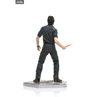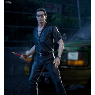 Figurine officielle de Ian Malcolm en résine mesurant environ 21 centimètres de haut, à l'échelle 1/10. Le fabricant est Iron Studios.