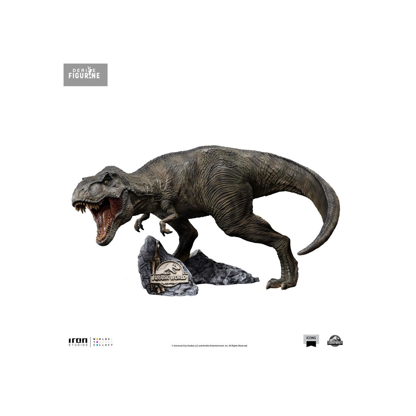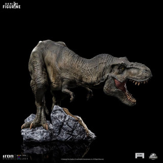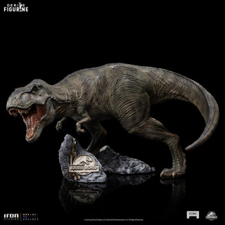 Figurine officielle de T-Rex en résine mesurant environ 13 x 20 x 17 centimètres. Elle est issue de la collection Icons. Le fabricant est Iron Studios.